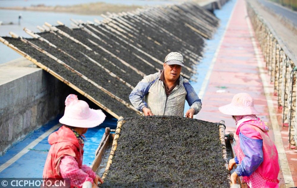 ↑2020年11月8日,浙江省温岭市坞根镇东门头村村民在革新塘晾晒紫菜。CICPHOTO/刘振清 摄