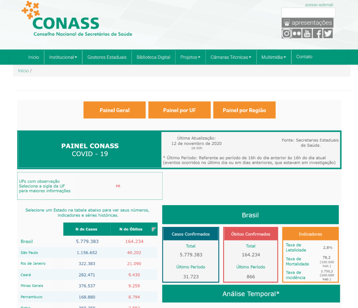截至当地时间11月12日,巴西全国卫生秘书理事会公布全国单日新增新冠肺炎确诊病例31723例,累计确诊5779383例,新增死亡病例866例,累计死亡164234人,死亡率为2.8%。由于巴拉那州卫生厅系统发生故障,12日疫情汇总数据中未包含该州当日疫情数据。