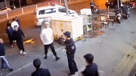 同行的吴警官和辅警马上冲过来与王警官一同将白衣男子制服,但与白衣男子同行的人员不断上来拉拽民警,意图让民警放开他。