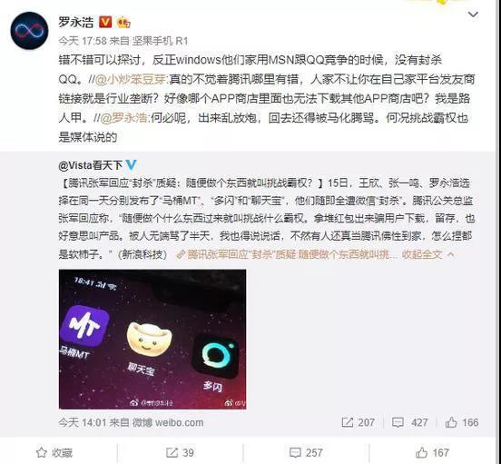 据媒体报道,2019年1月15日,王欣、张一鸣、罗永浩选择在同一天分别发布了“马桶MT”、”多闪”和“聊天宝”,但随即三款社交App被指遭微信“封杀”。腾讯公关总监张军回应称:“随便做个什么东西过来就叫挑战什么霸权。拿堆红包出来骗用户下载,留存,也好意思叫产品。”罗永浩对此也在微博进行“回怼”,“错不错可以探讨,反正Windows他们家用MSN跟QQ竞争的时候,没有封杀QQ。”