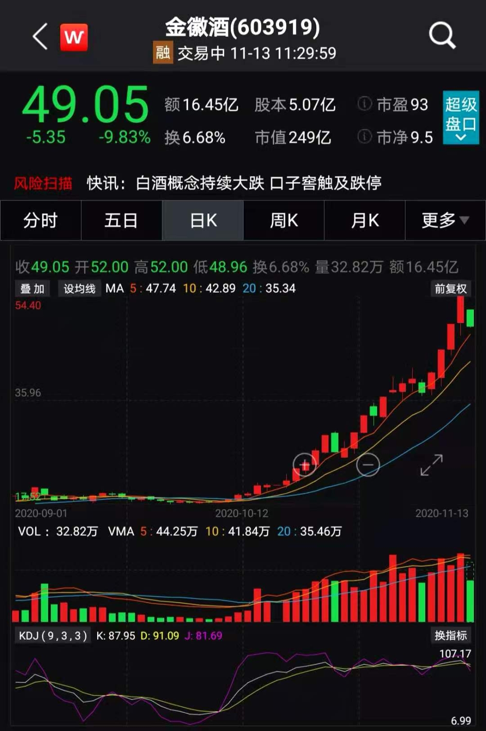 白酒股中,金徽酒受到重点关注,开盘领跌,盘中触及跌停。截至中午收盘,金徽酒报收49.05元/股,下跌9.83%,总市值为249亿元,半日成交额16.45亿元,换手率为6.68%。
