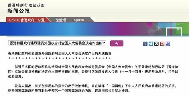据香港特区政府网站11月14日消息,就近日多国的行政和机构组织对全国人民代表大会常务委员会(全国人大常委会)关于香港特别行政区(香港特区)立法会议员资格的决定作出毫无根据的指责,香港特区政府发言人14日表示坚决反对,并予以强烈谴责。