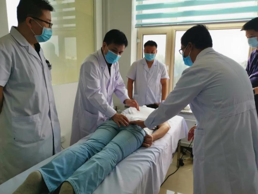 ▲今年8月,林定坤医生(左二)为鄂温克旗人民医院的医生示范治疗手法