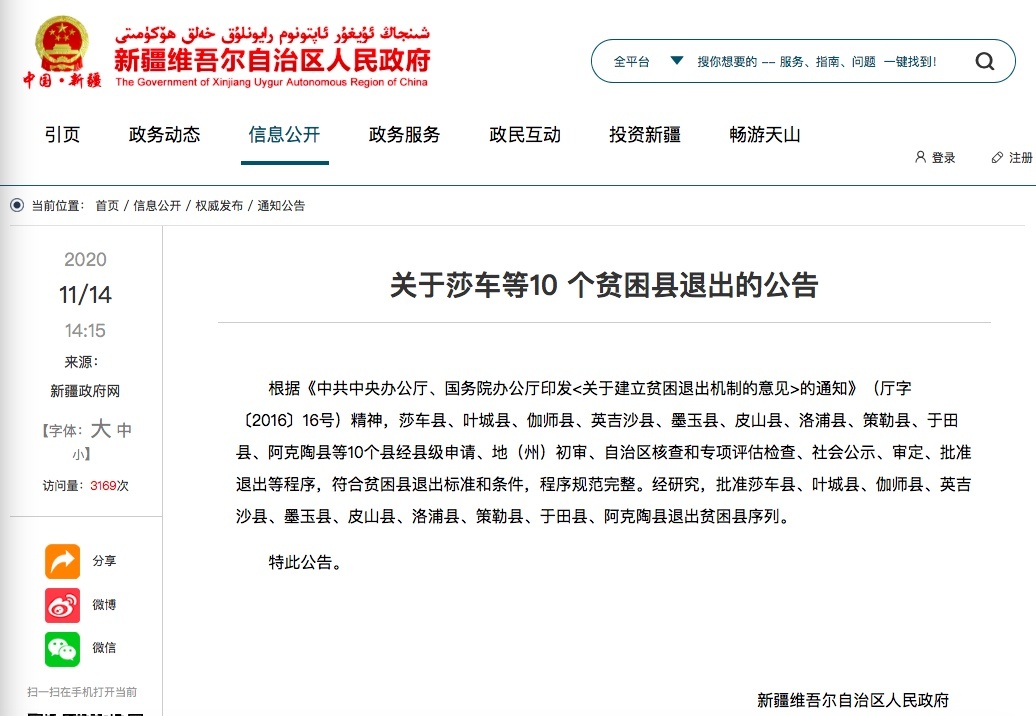 据新疆维吾尔自治区人民政府官网消息:根据《中共中央办公厅、国务院办公厅印发的通知》(厅字〔2016〕16号)精神,莎车县、叶城县、伽师县、英吉沙县、墨玉县、皮山县、洛浦县、策勒县、于田县、阿克陶县等10个县经县级申请、地(州)初审、自治区核查和专项评估检查、社会公示、审定、批准退出等程序,符合贫困县退出标准和条件,程序规范完整。