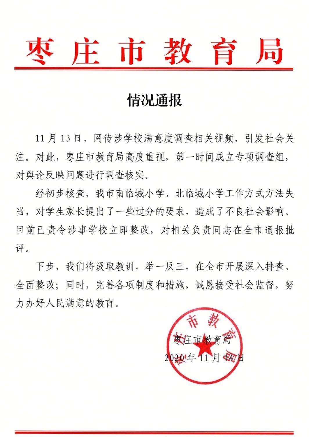 经初步核查,枣庄市南临城小学、北临城小学工作方式方法失当,将往年满意的调查问题整理后发给家长,并提供所谓的“标准答案”;让家长收到满意度调查链接后第一时间要报告老师,并要求在老师的帮助下完成答题,造成了不良社会影响。目前已责令涉事学校立即整改,对相关负责同志在全市通报批评。