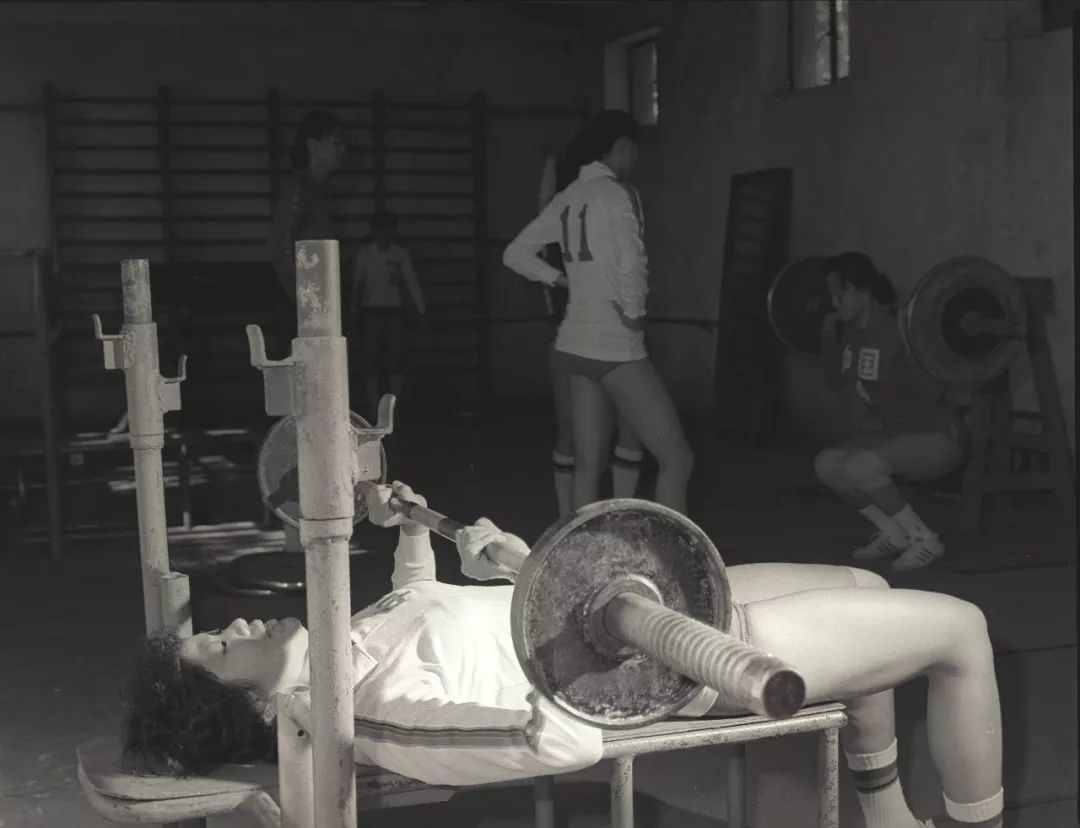 △1982年,郎平在做臂力训练。