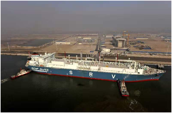 图为11月5日,浮跃在天津港码头上的“希望号”FSRU(浮式储存及再气化装置)开始接卸从美国进口的LNG。