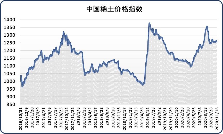 新华财经北京11月16日电(刘星麟)16日,中国稀土价格指数报1258.54点,较前一工作日下跌0.21点,跌幅为0.02%。氧化镨钕价格下调,下游企业谨慎采购,压价询单,多观望后市,上下游成交僵持,实际成交量不多。