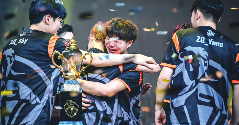 当英雄联盟的传奇选手简自豪-UZI与5位队友共同举起国旗,赛场上炫目的灯光透过红色旗帜,在选手身上渲染出了橘色光圈,这一片光芒同时也点燃了中国电竞产业的前路。