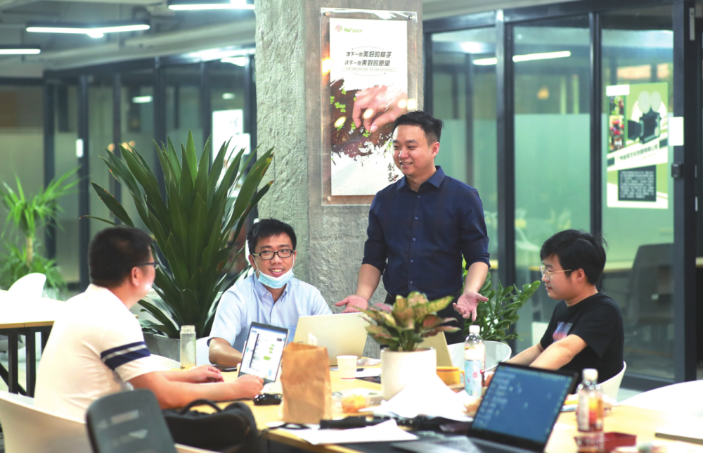5月18日,出生在台湾省嘉义县从事医药相关产业的青年台商陈鸿杰(右二)在广州汇龙台港澳青年创新创业基地与工作人员讨论工作 (卢烨/摄)