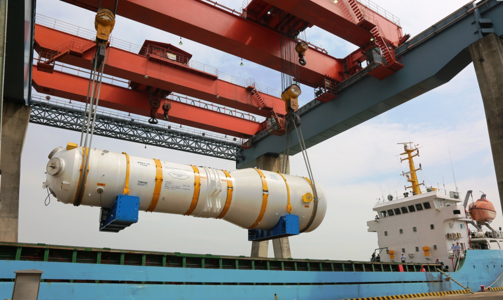 中国自主三代核电“华龙一号”国内ZH-65型蒸汽发生器在位于广州南沙的东方电气(广州)重型机器有限公司吊装出厂