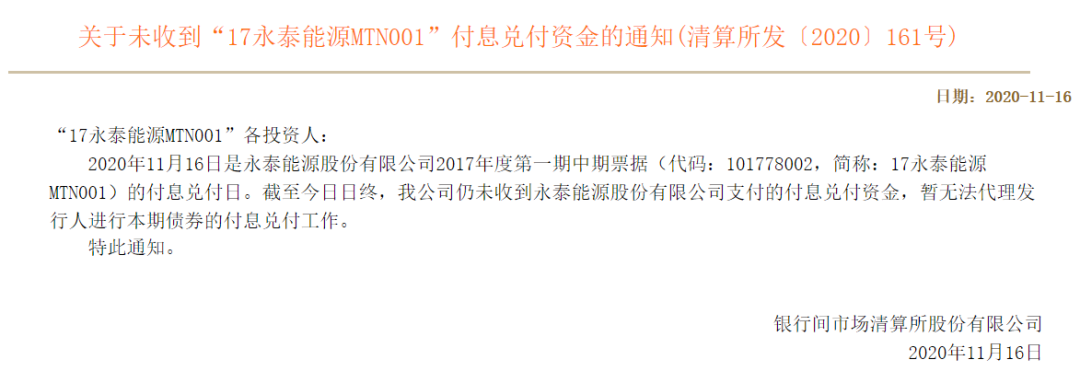违约“大户”永泰能源中票继续违约。上清所16日晚间公告,未收到“17永泰能源MTN001”付息兑付资金。此前,“17永泰能源MTN001”已实质性违约。
