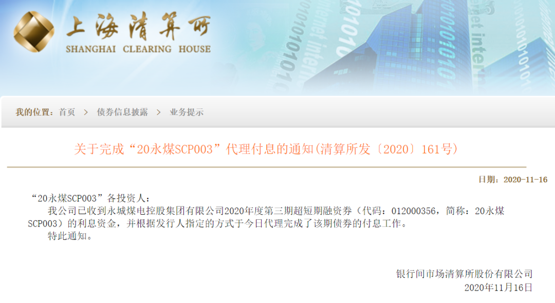 16日晚间,上清所公告完成“20永煤SCP003”代理付息。