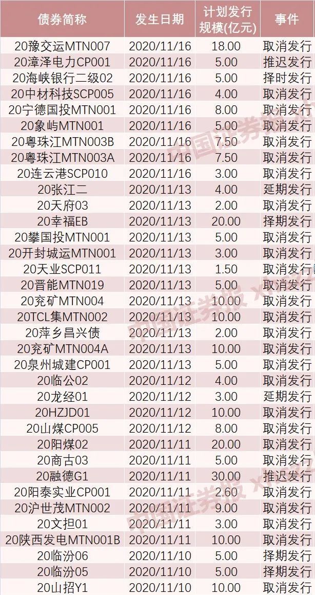 据统计,11月10日以来,已有超过30只债券取消或推迟发行,涉及金额超265亿元。