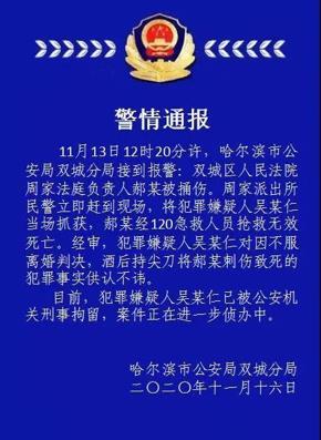 2020年11月13日12时许,哈尔滨市双城区人民法院周家法庭负责人郝剑法官在该法庭的收发室被犯罪嫌疑人吴德仁持刀捅刺,经抢救无效死亡。吴德仁当场被公安机关抓获。公安机关对该案正在进行侦办。