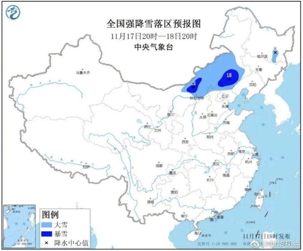 中央气象台17日18时发布今冬首个暴雪蓝色预警,预计17日至18日,黑龙江东南部、内蒙古中部和东部偏南地区、河北北部等地的部分地区有大雪,局地暴雪。这些地区新增积雪深度5至12厘米。同时,中央气象台继续发布暴雨蓝色预警,山东中部和东部、辽宁东部和南部等地的部分地区有暴雨,局部地区伴有短时强降水或雷暴大风等强对流天气。(高敬)