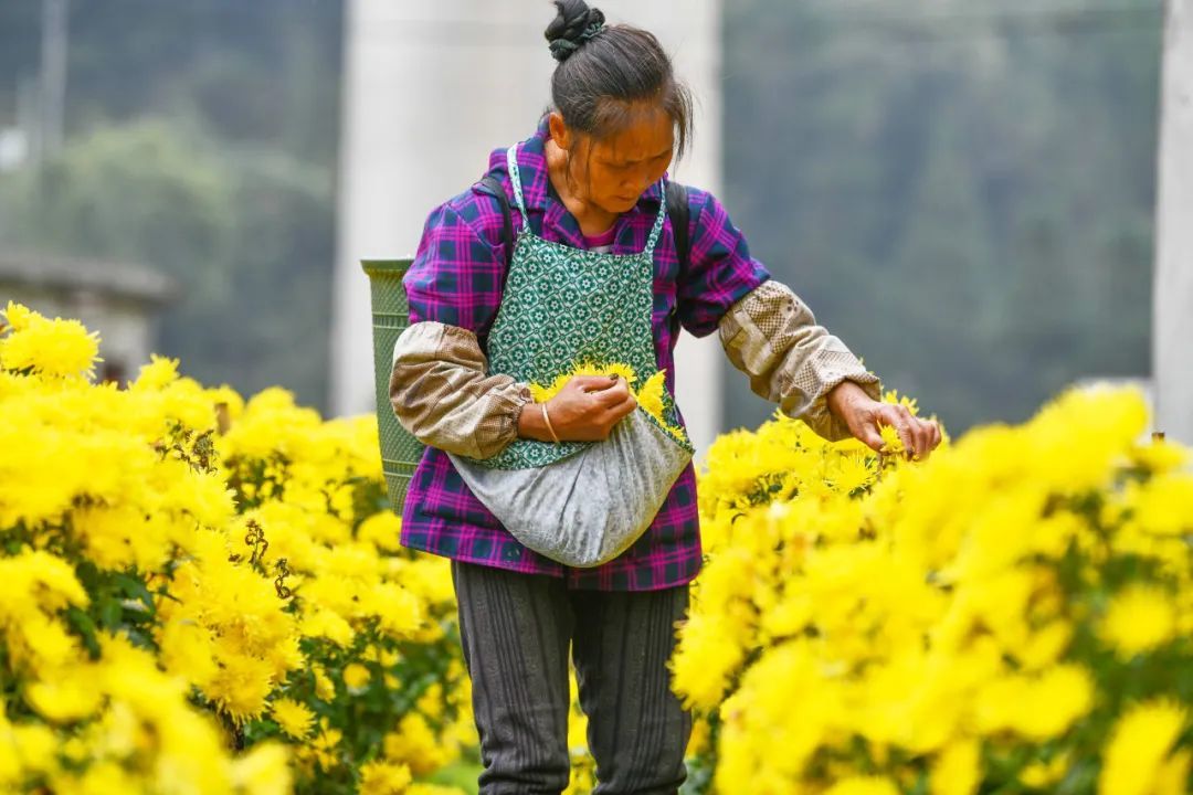 一个村民在采摘扶贫菊花 杨文斌 摄