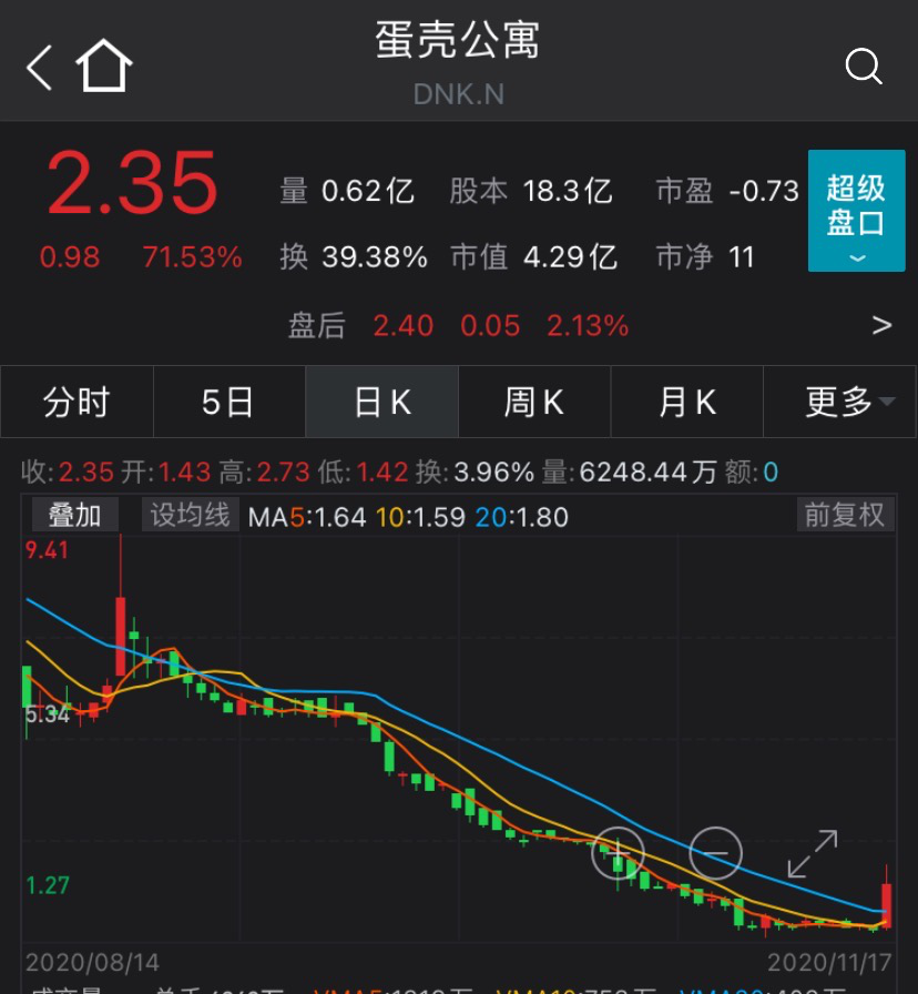 值得注意的是,在此之前,蛋壳公寓经历了近三个月的下跌。在8月26日至11月16日,蛋壳公寓股价从8.15美元一路跌至1.37美元,期间跌幅达83.19%。