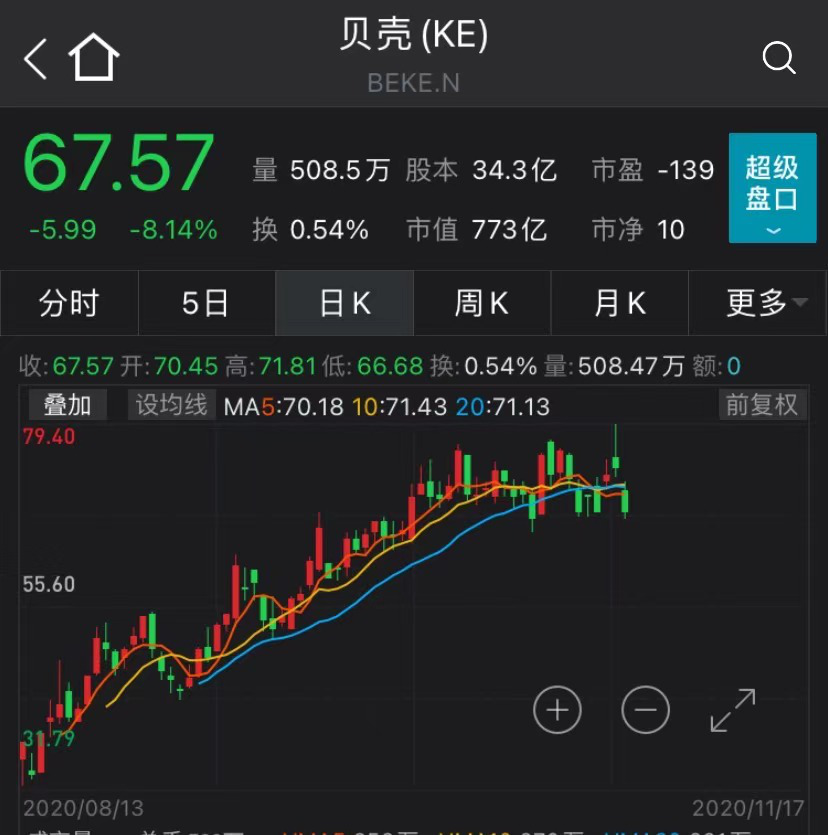 而上市以来股价一路上涨的贝壳17日收盘大跌8.14%。据Wind数据,贝壳最新股价为67.57美元,最新总市值为772.5亿美元;上市以来股价累计上涨237.85%。