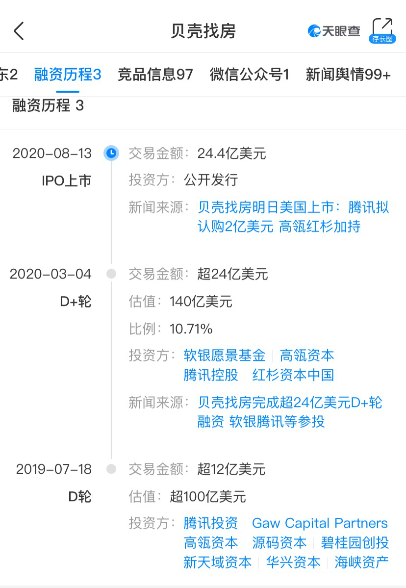 天眼查数据显示,去年3月,蛋壳公寓获得由蚂蚁金服、老虎环球基金联合领投的5亿美元C轮融资。Wind数据显示,腾讯持有贝壳12.10%股份,为其二股东。