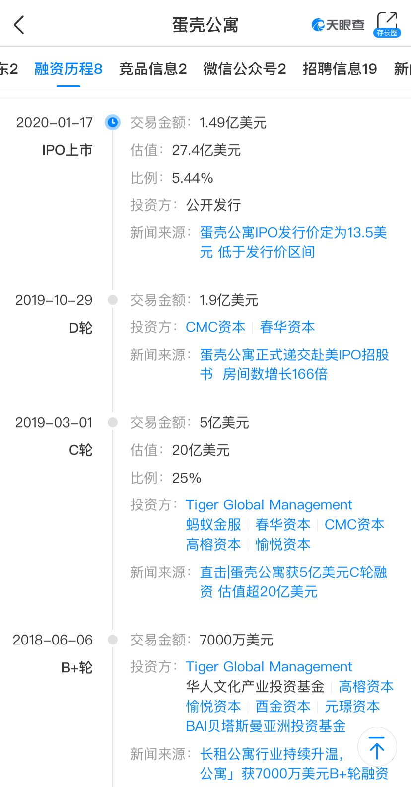 天眼查数据显示,去年3月,蛋壳公寓获得由蚂蚁金服、老虎环球基金等联合领投的5亿美元C轮融资。