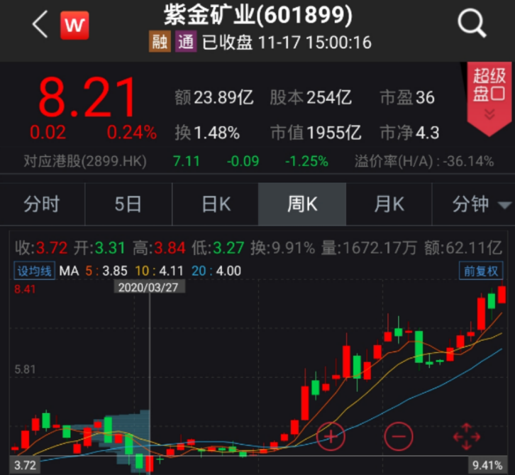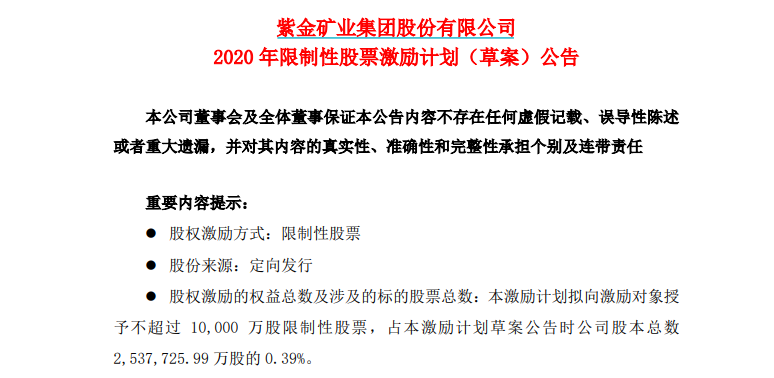 11月17日晚间,紫金矿业抛出2020年限制性股票激励计划(草案),拟对包括董事长陈景河、总裁邹来昌等700人授予不超1亿股的限制性股票,占公司总股本0.39%。首次拟授予9510万股,预留不超490万股。首次授予价4.95元/股,授予价为公告日前1个交易日交易均价的6成。