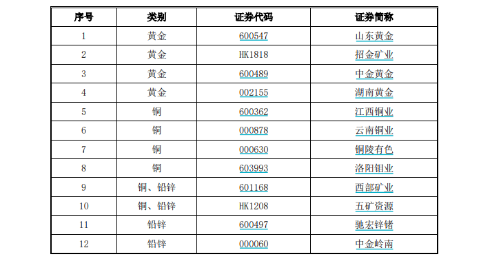 就对标公司来看,黄金对标山东黄金、招金矿业等;铜对标江西铜业、云南铜业等;铅锌对标企业包括西部矿业、五矿资源等。