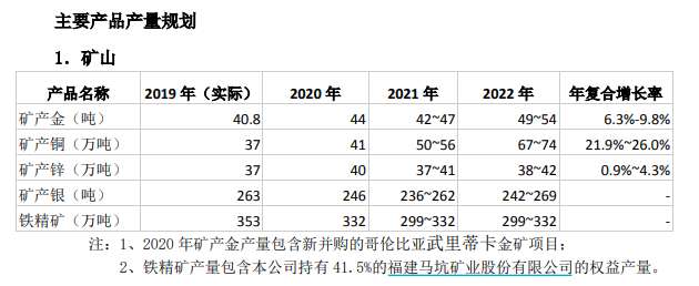 紫金矿业年初曾发布《关于未来三年(2020-2022)工作指导意见的公告》,未来三年的核心目标是主要矿产品产量实现大幅度增长,冶炼、加工、贸易和资本运营能力进一步提高;至2022年,在市场总体平稳条件下,力争销售收入、归属母公司净利润、经营净现金流等指标实现大幅增长;保有资源储量进一步提高,财务指标显著优化,行业地位大幅提升。