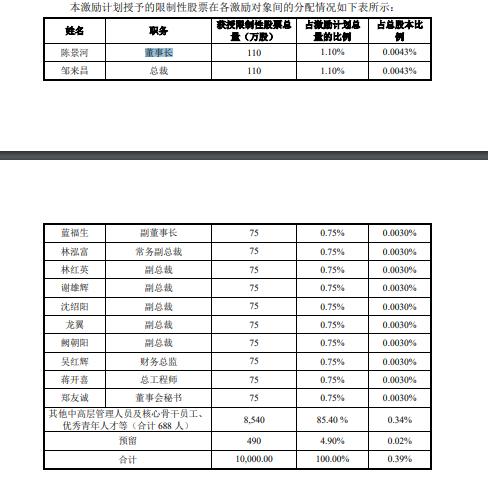 就拟实际分配情况来看,董事长、总裁均将获授110万股,各占激励计划的1.10%;副董事长、副总裁等10人将分别获授75万股。