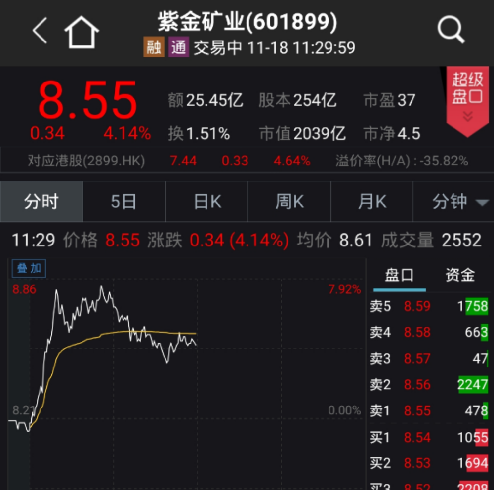新华社北京11月18日电(中国证券报记者张军)今日早盘,紫金矿业低开高走,截至午盘,报8.55元/股,涨4.14%,成交额25.45亿元。