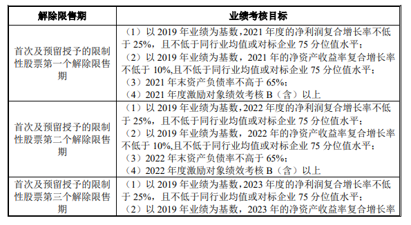 如第一个解除限售期,业绩考核目标包括:以2019年业绩为基数,2021年净利润复合增长率不低于25%,且不低于同行业均值或对标企业75分位值水平;以2019年业绩为基数,2021 年净资产收益率复合增长率不低于10%,且不低于同行业均值或对标企业75分位值水平;2021年末资产负债率不高于65%;2021年度激励对象绩效考核B(含)以上。