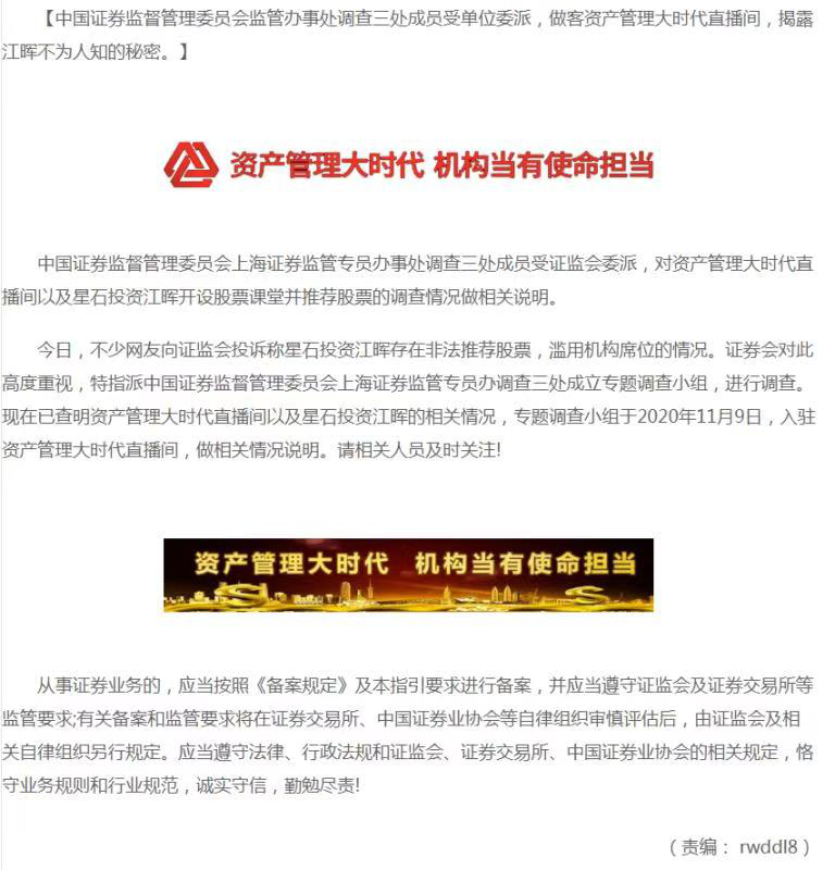 骗子冒充监管称不少网友向证监会投诉江晖存在非法荐股、滥用机构席位的情况,对此证监会高度重视,指派中国证券监督管理委员会监管办事处调查三处成员成立专题调查小组,并做客资产管理大时代直播间,揭露江晖不为人知的秘密,并对相关情况进行说明。
