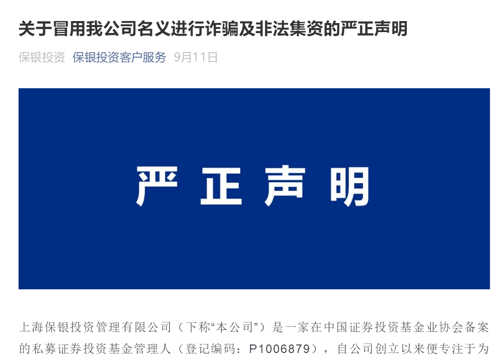 9月份,保银、东方港湾、东方马拉松等也遭遇过类似情况,并发布了警惕诈骗的声明。