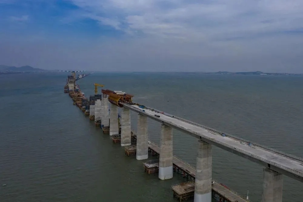 近日,新建福厦铁路湄洲湾跨海大桥作业加紧推进。建设单位克服入秋以来海上风大浪大、昼夜温差大等困难,确保工程进度。