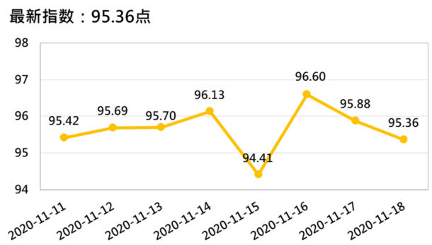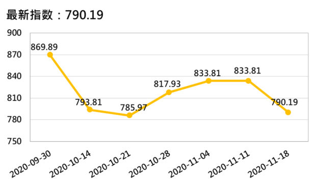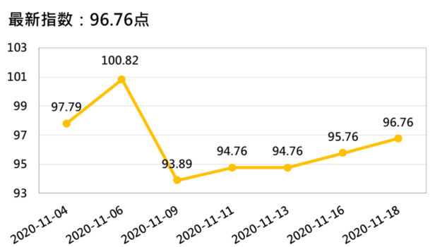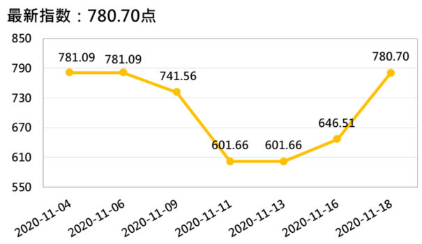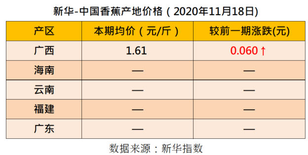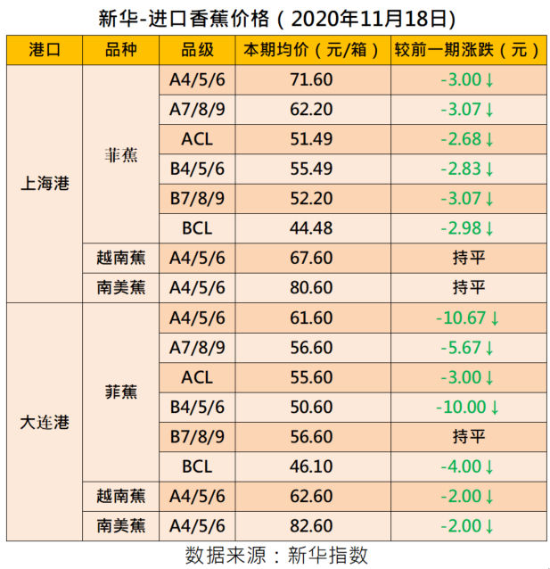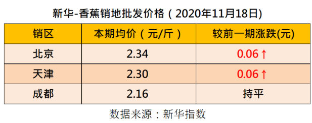 新华财经北京11月19日电(杨猛、李伯罧、汪伟坚)新华-中国香蕉产业四大指数显示,截至11月18日,国内香蕉产地价格指数报96.76点,较上一发布日(2020年11月11日,下同)94.76点上涨2.11%;香蕉销地批发价格指数报95.36点,较上一发布日95.42点下跌0.06%;进口蕉价格指数报790.19点,较上一发布日833.81点下跌5.23%;皇帝蕉产地价格指数报780.70点,较上一发布日601.66点上涨29.76%。
