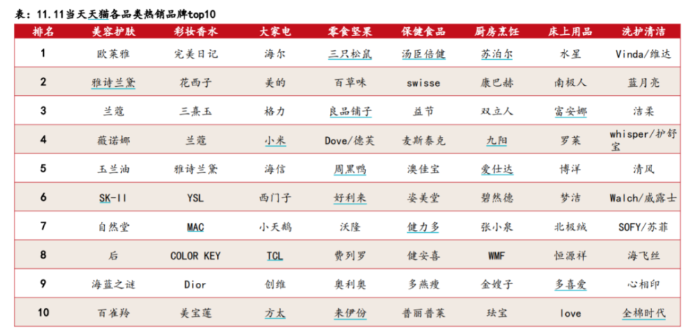 国信证券指出,透过此次“双11”重要窗口期,可以看到平台竞争、品牌营销等方面表现出了一系列新趋势:各大平台加大折扣优惠力度,加速下沉获取新客,其中直播带货越战越火,社交及内容平台的加码也使得整体竞争日趋激烈,而美妆个护依旧是促销季中的主力品类,虽然国际大牌仍占主导,但优质国货品牌正加速崛起。