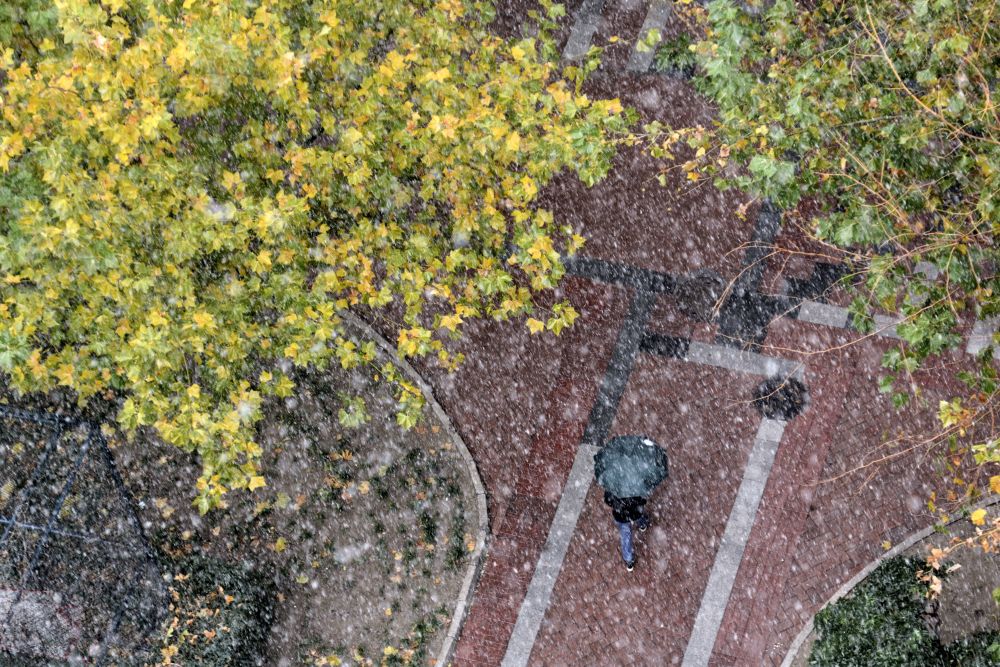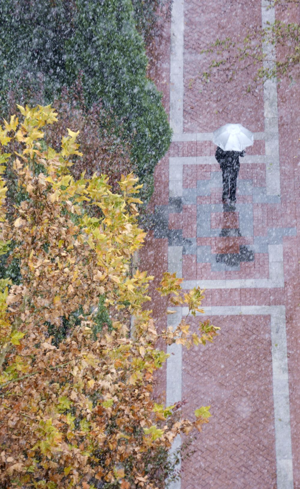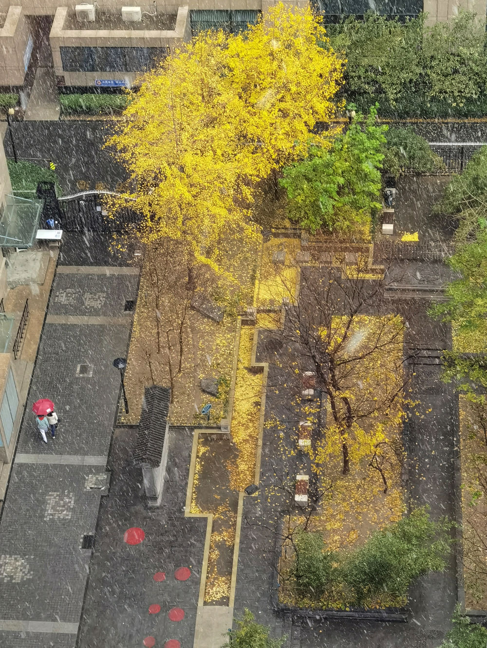 11月21日,行人在北京西城区一个小区内冒雪行走。新华社记者 罗晓光 摄