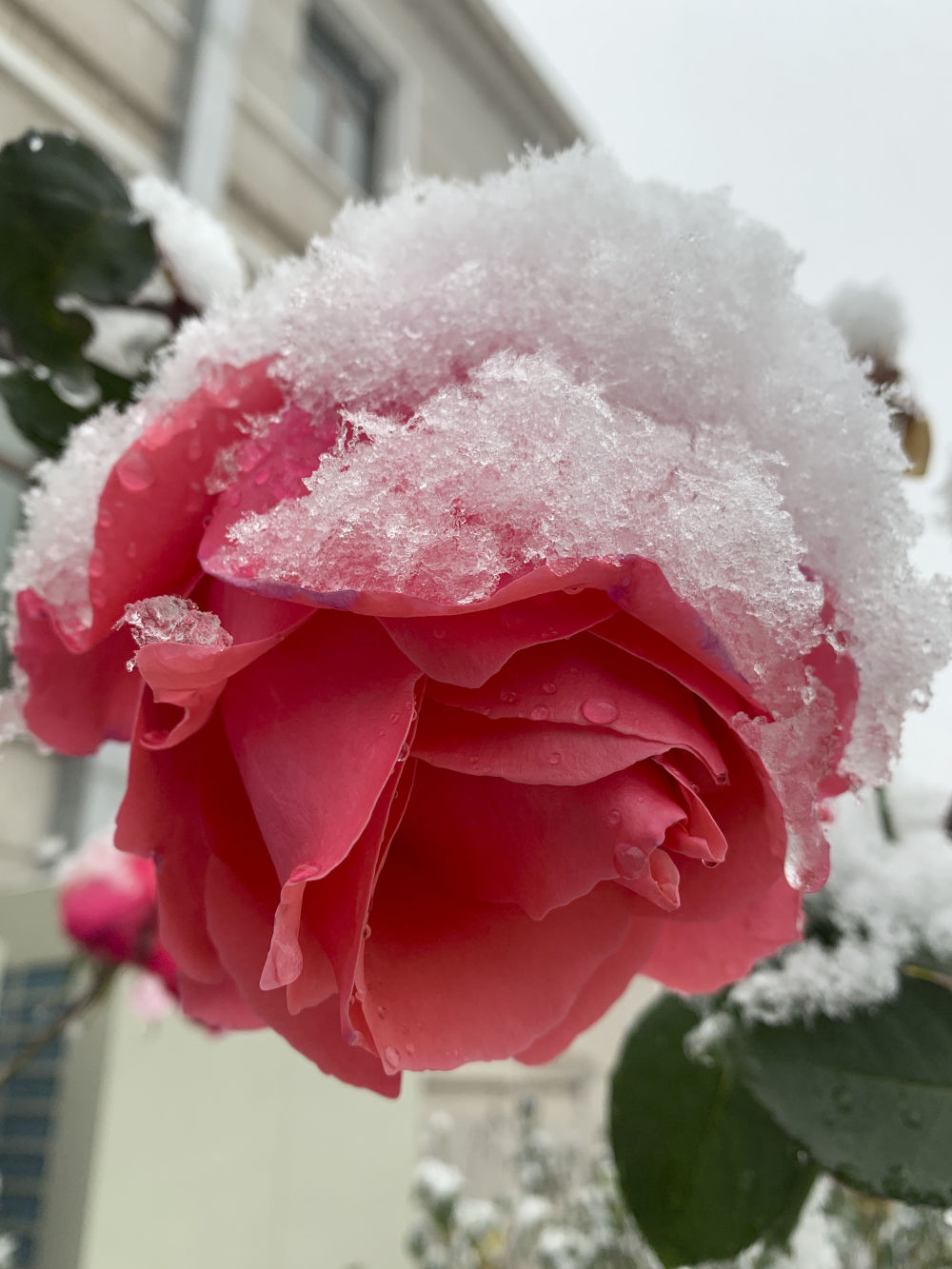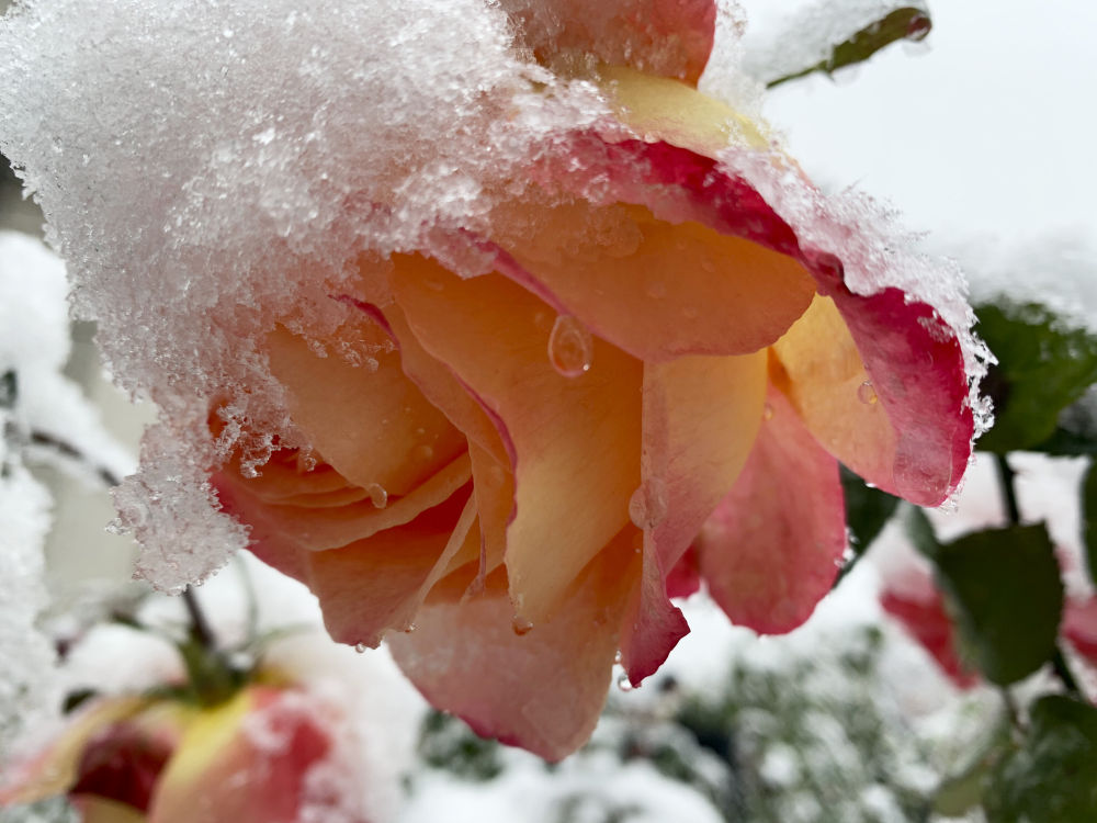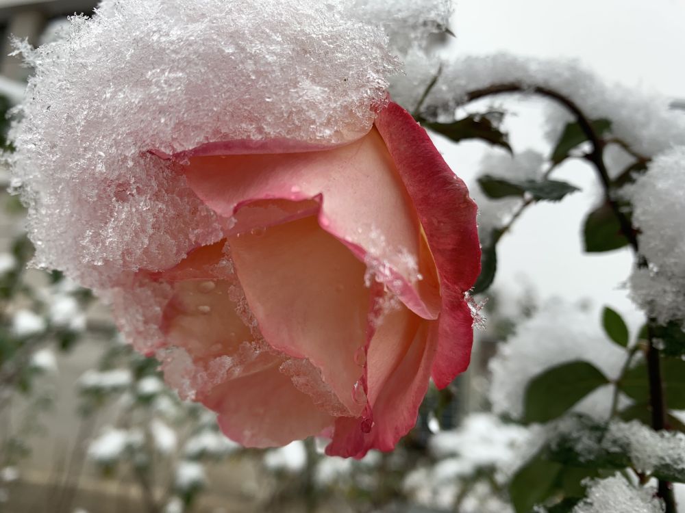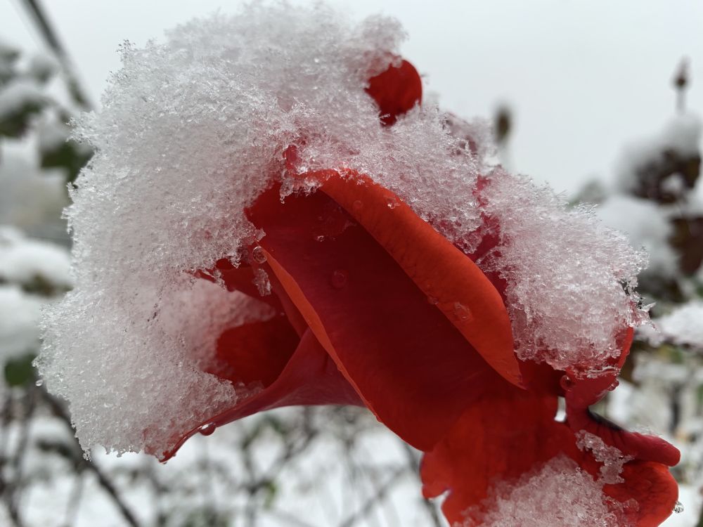 这是11月21日在北京郊区拍摄的花朵上的积雪。新华社记者 刘洁 摄