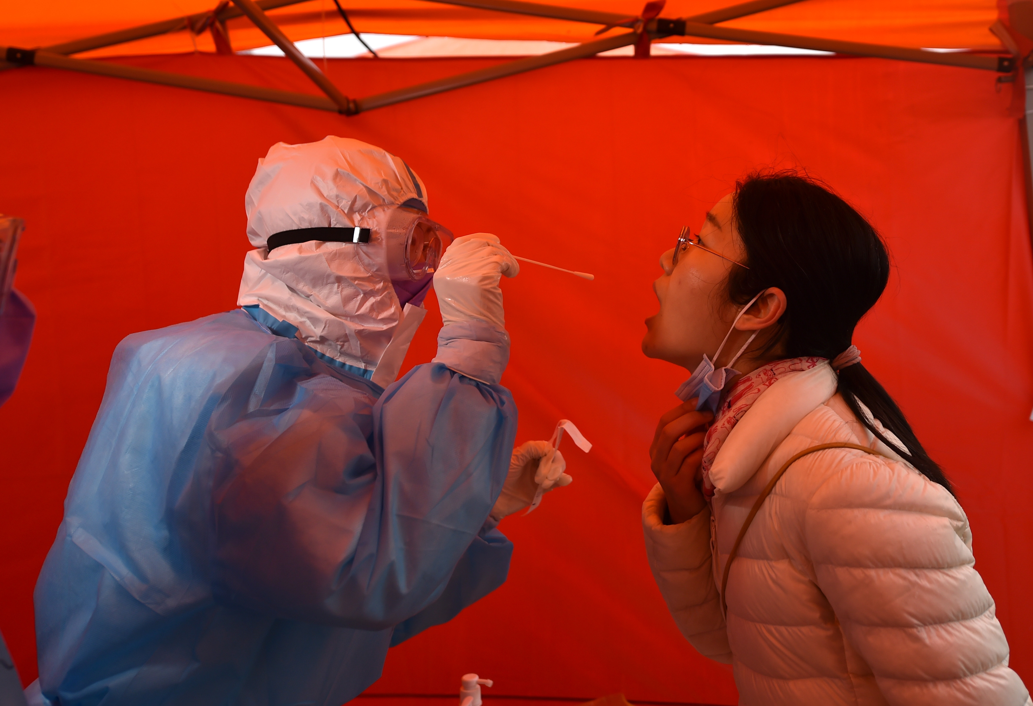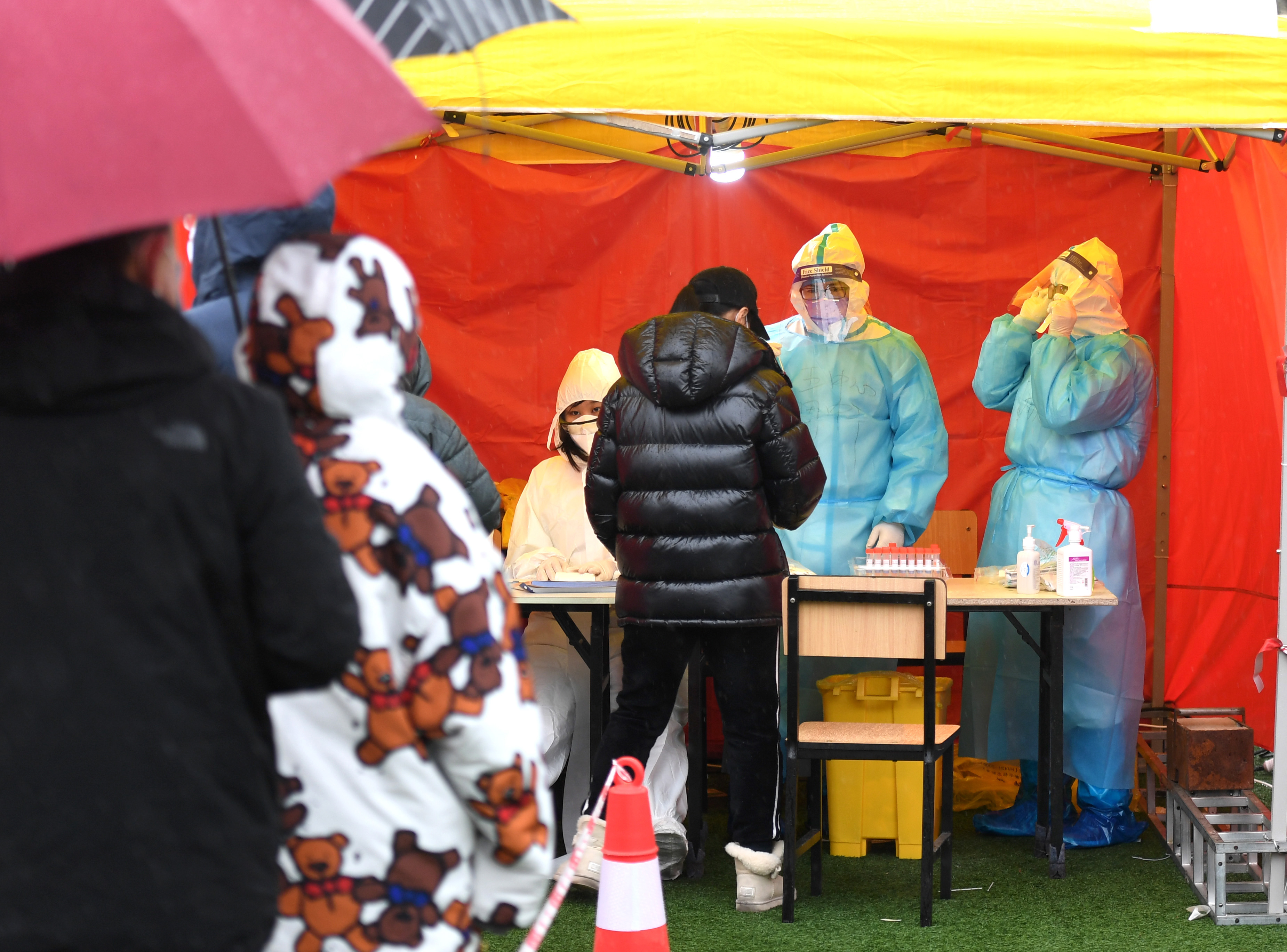11月21日,天津滨海新区居民在泰达第二体育场核酸检测点进行核酸检测。