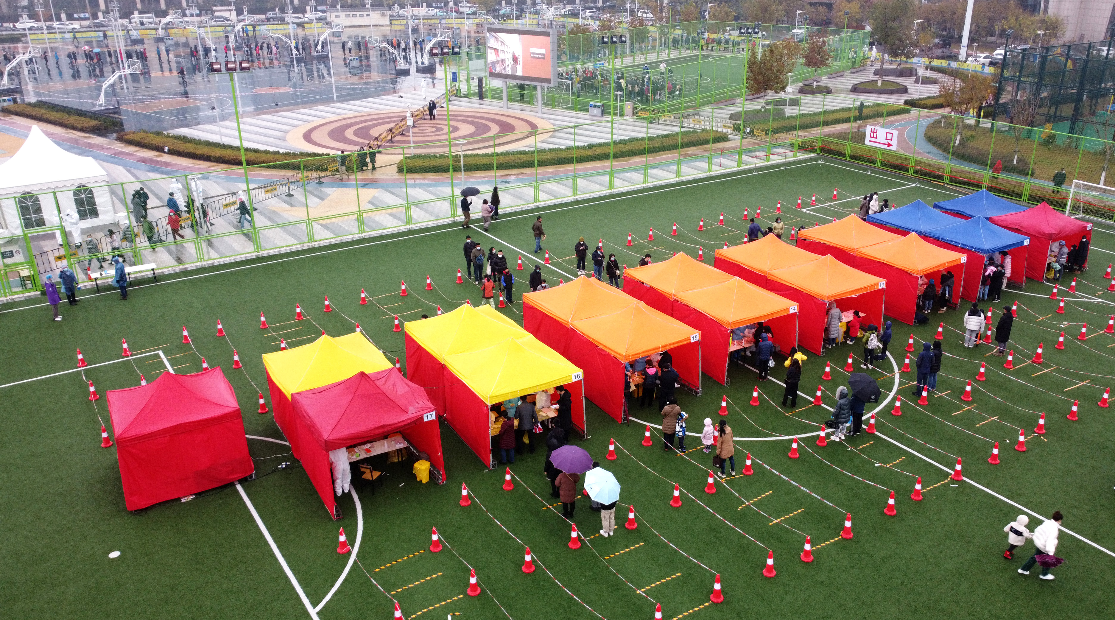 11月21日,天津滨海新区居民在泰达第二体育场核酸检测点进行核酸检测(无人机照片)。
