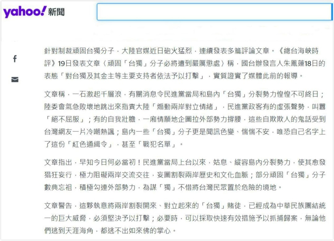 台湾《旺报》、中时新闻网、台湾雅虎新闻等岛内媒体将“总台海峡时评”视作大陆官方表态,第一时间刊载文章内容指出,顽固“台独”分子,必遭严厉惩处。