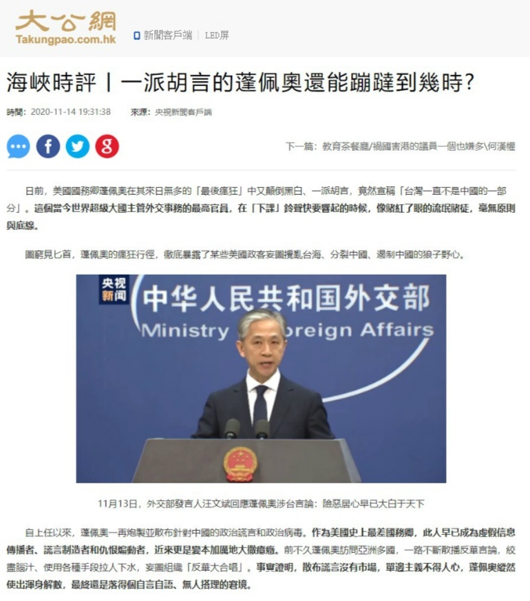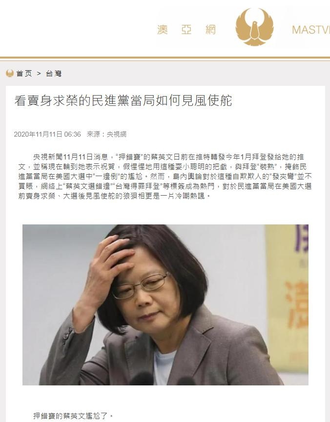 11月7日至11月19日,中央广播电视总台“看台海”新媒体平台连续发布《历史昭示未来 事实从未改变》《看卖身求荣的民进党当局如何见风使舵》《一派胡言的蓬佩奥还能蹦跶到几时?》《顽固“台独”分子必将遭到严厉惩处》等四篇“总台海峡时评”,重磅出击,给“台独”以极大震慑!系列评论充分揭露民进党当局见风使舵、卖身求荣的丑恶面目,有力批驳某些美国政客妄图搅乱台海、分裂中国、遏制中国的狼子野心。评论重申,大陆和台湾同属一个中国的事实从未改变,民族复兴、祖国统一,是包括台湾同胞在内的全体中华儿女的共同责任。严正警告一切“台独”分子,若执迷不悟、顽抗到底,必将受到两岸人民的共同谴责和法律的严厉惩处。