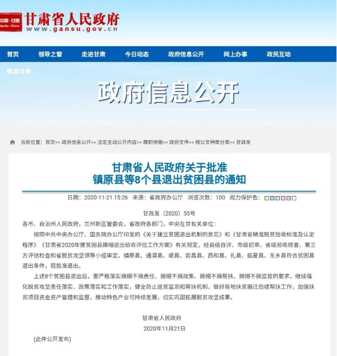 央视新闻11月22日消息,11月21日,甘肃省人民政府发布《关于批准镇原县等8个县退出贫困县的通知》,批准镇原县、通渭县、岷县、宕昌县、西和县、礼县、临夏县、东乡县等8个贫困县摘帽退出贫困县序列。