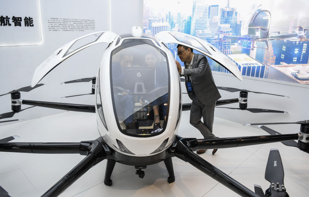 11月19日至21日,2020中国5G+工业互联网大会在位于武汉的中国光谷科技会展中心举行,参观者了解一台自动驾驶飞行器。新华社记者 程敏 摄