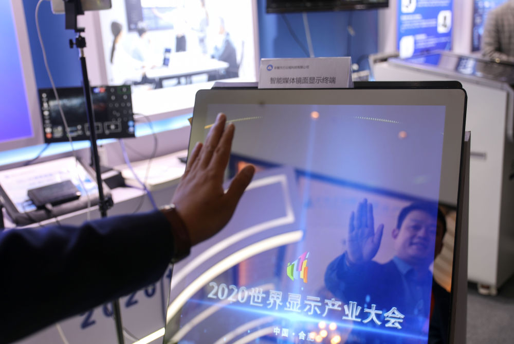 11月20日,工作人员在演示体感触控智能媒体镜面终端。新华社记者 曹力 摄