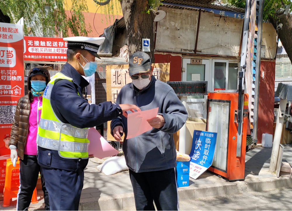 4月23日,社区交警陈文军在位于北京市丰台区的蒲黄榆第一社区发放畅通生命通道倡议书(丰台交通支队供图)