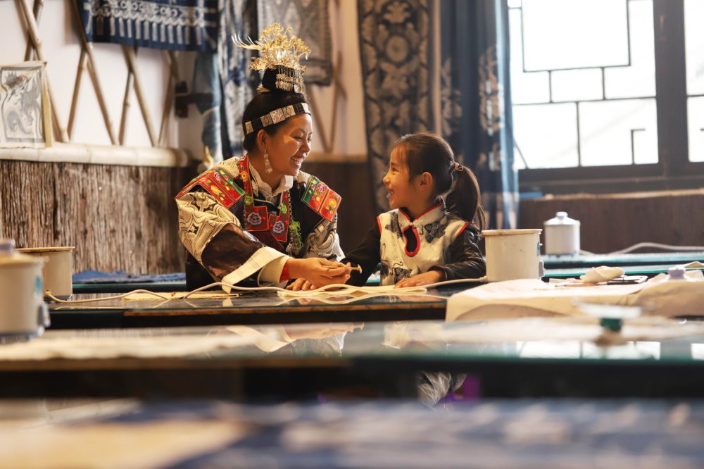 贵州省黔东南苗族侗族自治州丹寨县万达小镇,吴晓慧小朋友在学习使用腊刀绘制蜡画