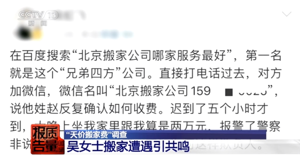 有这样经历的不只吴女士一个,他们在搬家时经历的情况和吴女士的遭遇有惊人的相似之处,都是通过知名网络搜索平台推荐,预定了名称中带有兄弟字样的搬家公司,在结账时都遭遇了搬家公司的肆意加价。
