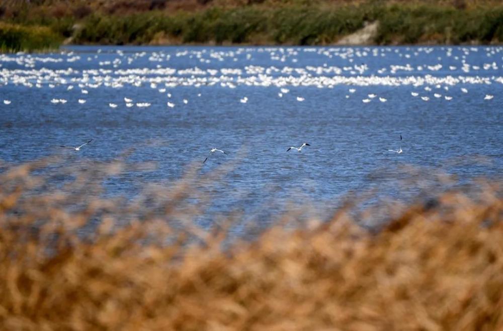 “偷”走他鱼的,是乌泱乌泱的候鸟,尤以成群结队的东方白鹳最为惹眼。这些通体雪白、飞羽泛黑的国家一级保护动物,从北向南长途迁徙,这里是重要的“驿站”。