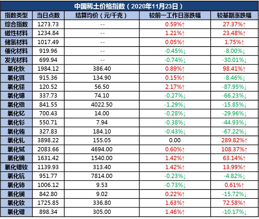 新华财经北京11月23日电(刘星麟)23日,中国稀土价格指数报1273.73点,较前一工作日上涨7.45点,涨幅为0.59%。氧化镨钕价格继续上涨,上游厂家惜售挺价,下游磁材企业订单稳定,现货供应偏紧对价格形成支撑。